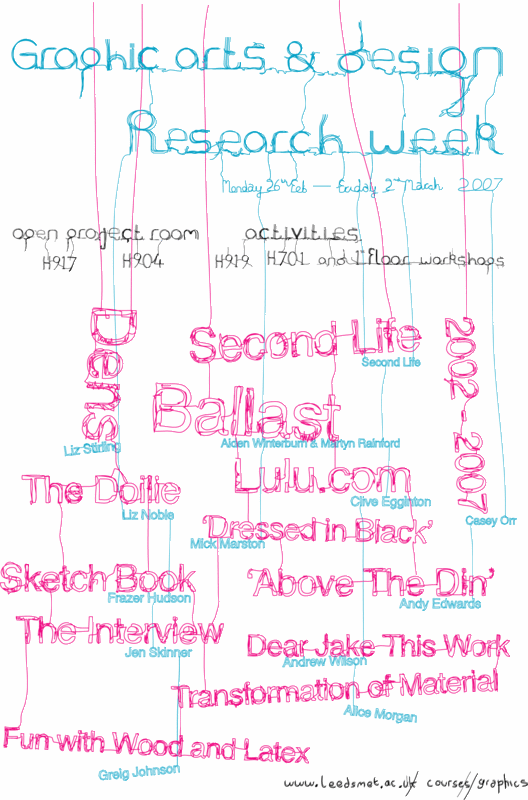 I made a poster for the staff research week. I was a response to all the text information that needed to be on it. Research leads to many possibilities and it often inter-links and overlaps to other areas so thats why I had lots of messy lines connecting. Plus I had to respresent the course a bit and have something experimental which is what th course is about. Plus simple contrasting colours make it easyily stand out in the sea of posters that are all over uni walls. It was a fairly positive outcome to a week of mistakes and events out of my control, like my original piece of work that I had planned got stolen which I talked about in the previous post so all in all it was good.